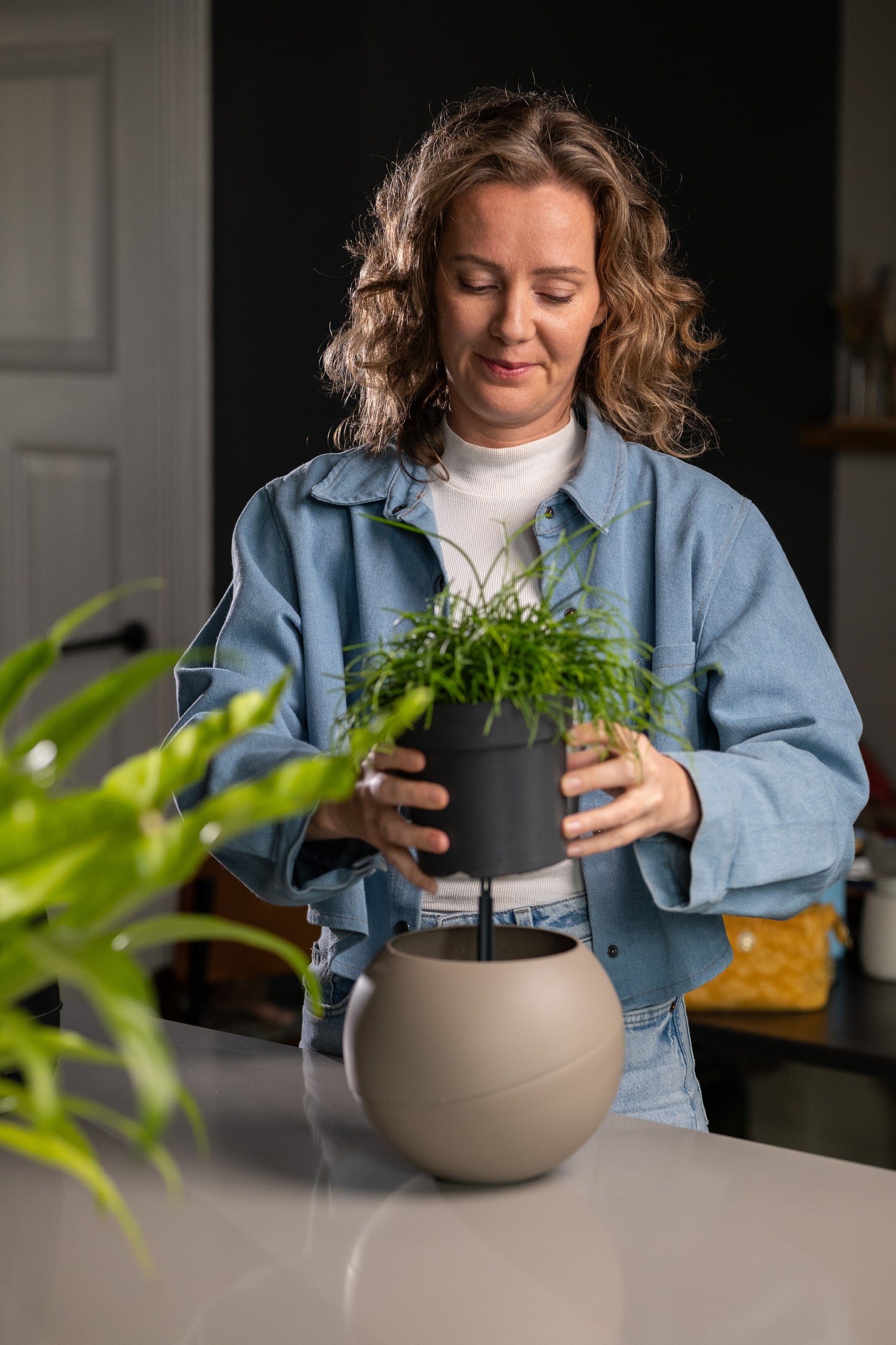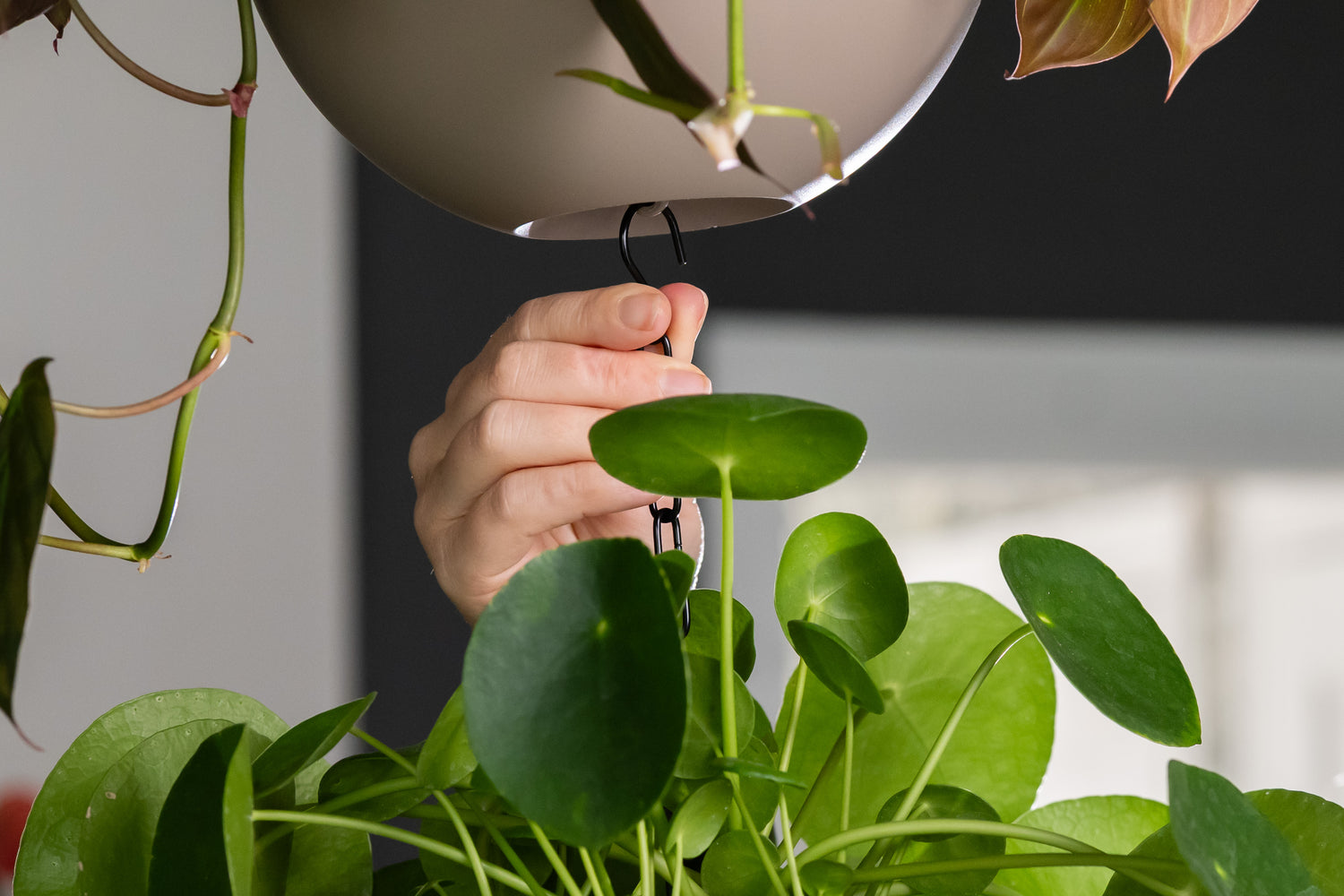 Draai het ophangsysteem in de Globee vast. En plaats je planten pot over dit ophangsysteem.